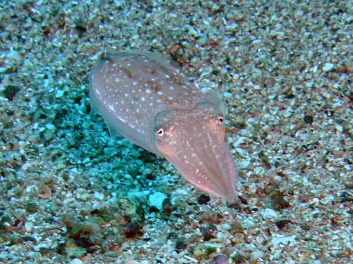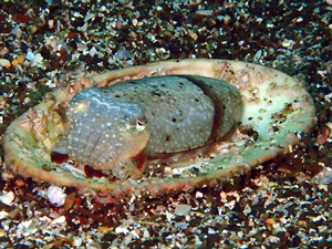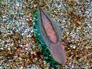 | 砂泥底。主にビーチ。なんでも背中にひし形マークがあるのが特徴らしい。 いろいろ撮りだめた画像を見返すとたしかにひし形マークがある。伊東では砂地(貝殻の破片が多い)が白いためか、白っぽい個体ばかりうつっていた。 とぼけた眠そうな目のものばかりだった! |