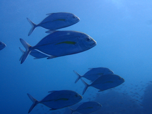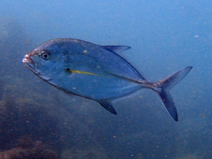 | 初夏から秋にかけ見られる回遊魚。 主にビーチでギンガメアジやクロヒラアジ等が多く出現する年に多くみられる。大抵は幼魚で大型の個体は伊東ではあまり見かけない。 体高は高く背鰭、臀鰭が鎌状に伸び胸鰭が長いのが特徴 成長に伴い青や黄色っぽい体色になり、青斑や黒斑が現れる。 |
