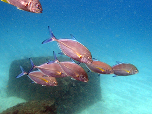 伊東では主に右写真の幼魚がビーチに現れカンパチ等の幼魚と混泳しているところを見かけます。 幼魚期は黄色い胸鰭が目立つ。 |