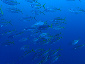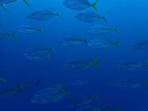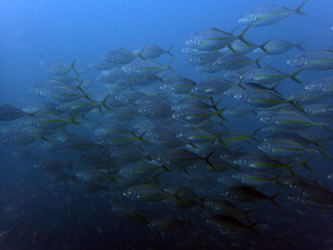 ビーチエリアで群れるシマアジ。 多い時は50匹ほどの群れでいます。 |
