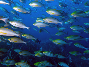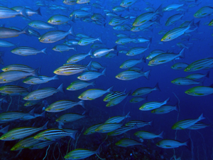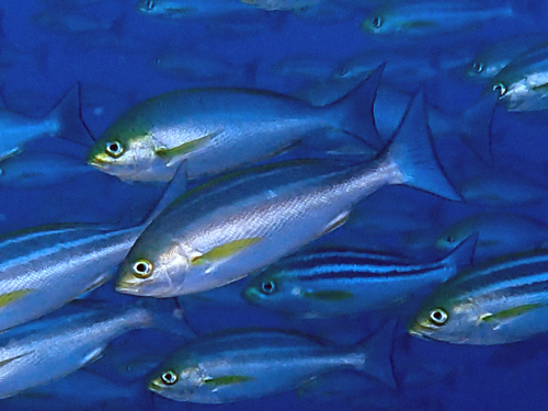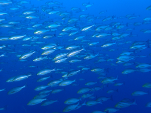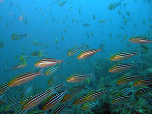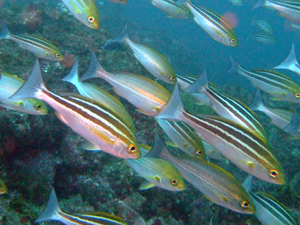 | 幼魚は黒い縦線が特徴で成魚になるにつれ線が薄れていく。 成魚は単体から少数の群れで、幼魚は大群になる。 伊東では各サイズを見ることができるが、幼魚の群れは伊東を代表する群れの一つで、圧倒的な量から成魚へあまり目がいかない。成魚になると30〜40cmに達し特徴の黒線もなくなることからカンパチやブリと勘違いされることもしばしば。 通年見られる種で各ポイントで見ることができます。 |
