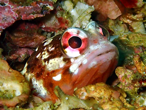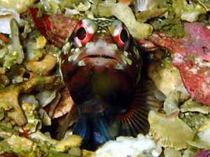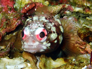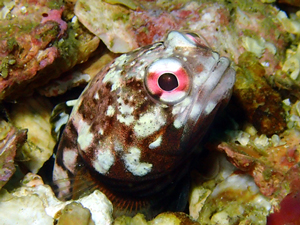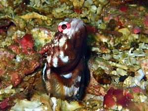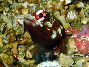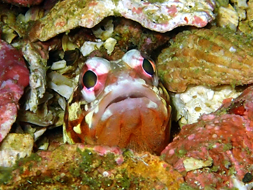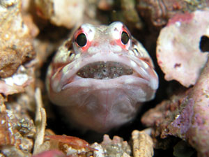 | ジョーフィッシュの愛称で知られ、基本巣穴から頭だけ出している。 ガレバに生息しており、巣穴の入口を貝殻等を起用にくわえ蓋をする。 せっせと巣穴を作る姿は愛くるしく、見ていて飽きない動き。 頭上に敵を察知すると巣穴奥に入り込み出てこなくなる。 親指サイズの丸い穴をガレバで見かけたら本種と疑ってよいかも。 (シャコ穴との見間違いに注意) |