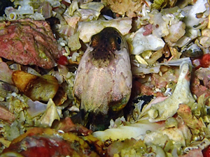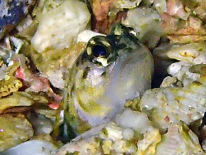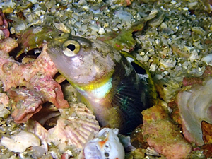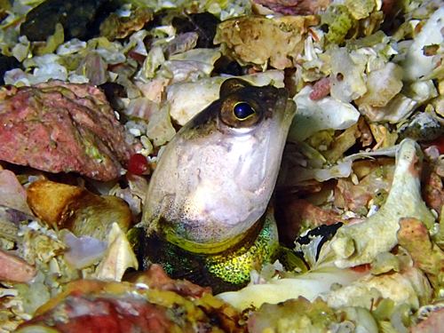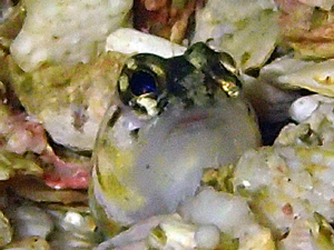 | 小指の爪ほどの大きさ(顔)でヒメジョーと呼ばれている。 本種は五島根中の23mガレバで見つかった。一つの巣穴から10〜15cm離れた場所に同じく巣穴があり、見つかった時は6個体が集まっていた。 五島根北のガレバにもいくつもいたので、見つけずらいだけでそこそこいるようです。 本種は巣穴に入った小さな砂利をプ・プと放り出すシーンをよく見かける。とにかく小さな小さなジョーフィッシュです。 なんでも、上の画像はオス個体のようです。ただほんとにオスなのか、婚姻色なのかは? |