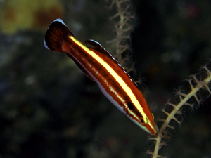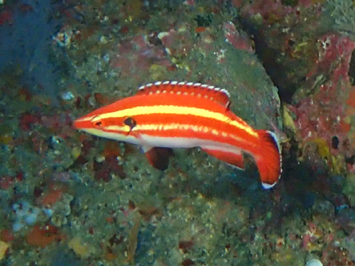 体色は赤く多黄色い縦縞が2本、腹側は白いのが特徴。また、水深30m以下の岩礁域でみられる深場のベラ。