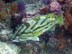 | 茶褐色の体色にV字の模様が入るのが特徴。見た感じイヤゴハタ成魚に似ているが模様で容易に判別できる。 岩礁域のやや深場に多く30m〜35地点では大型の個体が多い。 伊東では白根南のドロップ下に行けば大型の個体が数個体いて通年見る事が出来る。 |