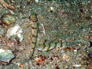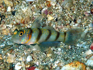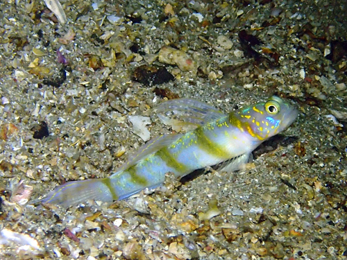| 背鰭、尾鰭ともに斑点なしで背鰭前からと胸鰭付近の上下から黄色横線が入る。 頬は黄色斑点というか線というか不規則な模様。 ナノハナフブキやキラキラハゼに似ているが鰭に斑点がないので見分けがつく。詳しくはナノハナフブキハゼのページで。 本種は白根南のドロップ側水深30m以下で見られた。近くにナノハナフブキハゼがいるので生息環境は似ている。 |
