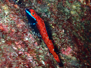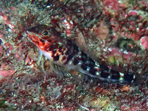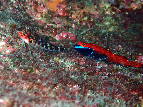 浅い岩礁域で見られる。オスは顔に青いラインあり。婚姻色時は体色が橙色になる。ヘビギンポ類は似たのばっかで困る。伊東ではあまり見ない種。