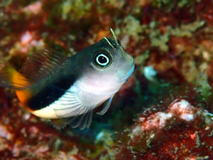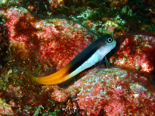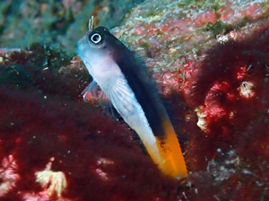| 白根の14m地点の根頭にあるちっこい穴に隠れていて基本顔だけ出している。時折出てきて餌食べてる。全身撮るなら少し待てば出てきます。 フタイロというだけあって基本色は上半身が紺色で下半身が橙色しているものが多いが、本種はカラーバリエーションのようでどちらかというと珍しい方の体色の個体のようです。基本色ならニラミギンンポに似ているが、こっちのタイプだと完全別種に見える! |
