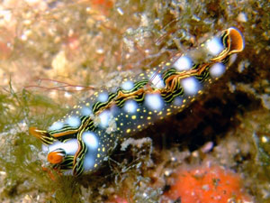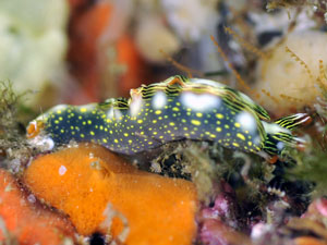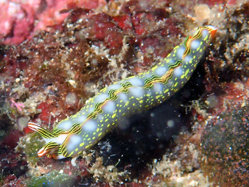 体色は暗い緑色。小さな黄色い斑点がちりばめられている。触角の先端と尾部は赤い。大きな特徴は背中に両側対象に並ぶ白丸。