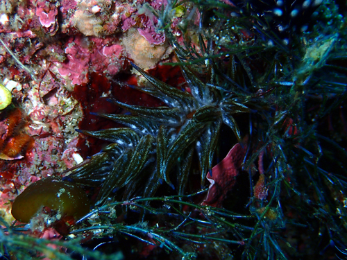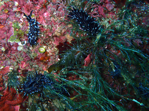 体色は緑、触角や角部の先端は紺。背中中央にオレンジの帯あり。