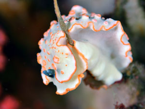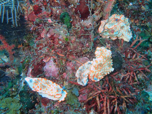 体色は薄黄色。各縁は橙色で縁取られる。背中にはドーナツ型のイボ突起が複数あり橙色。にじんだ暗色斑も見られる。触角は黒地に青いスジ。5cm以上のものも多くそこそこ大型。伊東ではかなりポピュラーなウミウシで多くの個体を観察できる。
