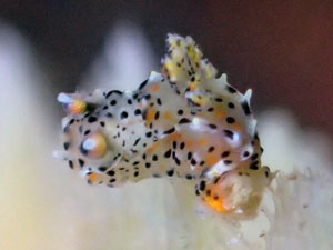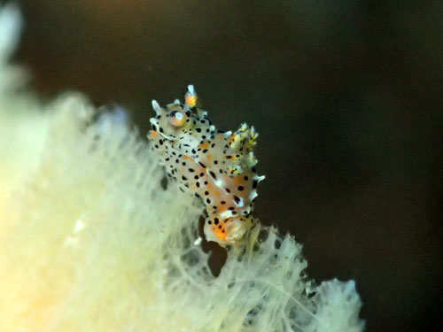 最初、肉眼では分からないレベルだったので、あまりに幼体過ぎて特徴はつかみづらいが、黒と橙色の細点が点在している事や外套膜縁に小さな白色の突起がることから本種としている。