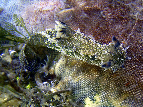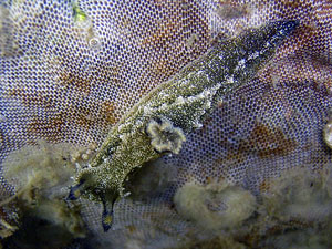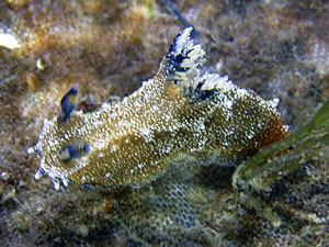 体色は緑がかった茶色で頭部から背側周辺に突起あり。触角は紺色で中央やや上に黄色が入る。鰓も紺で体色同様のスジ。体全体に細かな白点がちりばめられている。