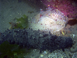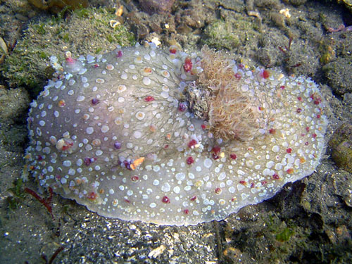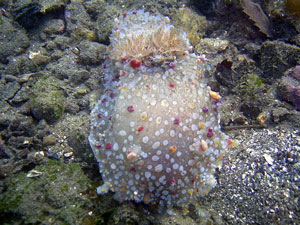 体色はくすんだ白色で赤や紫、黄色の突起を有する大型種。