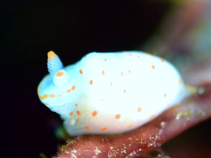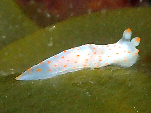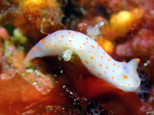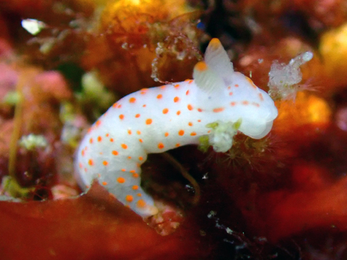 白地に橙赤色の斑点がちりばめられている。小型のウミウシ。
