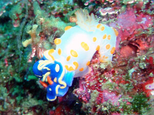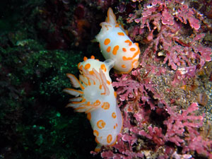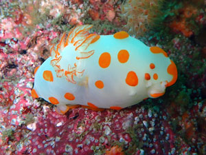 | 白地に橙色の突起を持つ。触角は橙色で鰓は白地に橙色のスジが入る。5cm以上の個体もおおくそこそこ大型。 ウミウシを食べるウミウシイーターで知られ、捕食中のシーンもよく見られる。 |