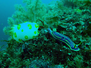 交接中の個体。 ウミウシの交接菅は右側なのかもしれない。 多種の交接もみな右側から行っている気がする・・・。 |