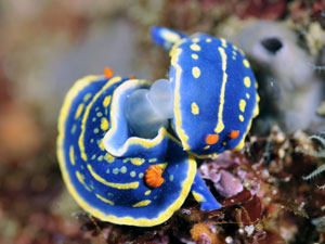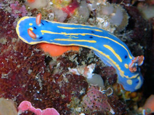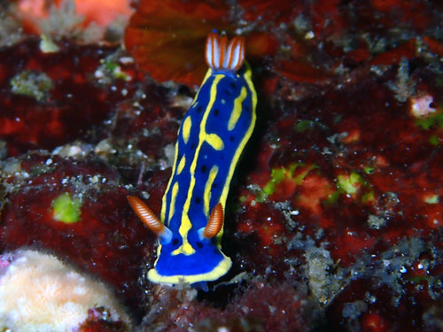 体色は青で背側の縁は黄色く縁取られる。触角の間から鰓まで中心に黄色い線が走る。また、断続的に黄色線と黒色斑が並ぶ。触角はオレンジ色。個体によって模様はまちまちで、断続的な黄色線や黒色斑が無い個体もいる鰓は白でオレンジのスジが入る。