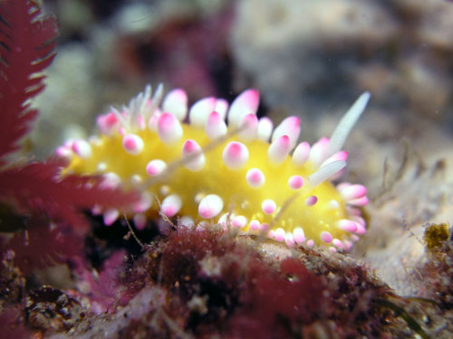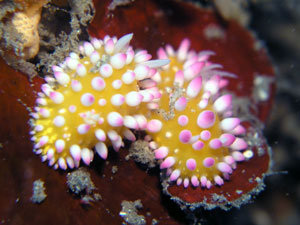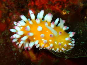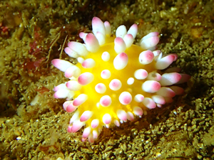 体色は黄色。突起の先がピンク色。、触角は白。ぱっと見突起は太めで丸みを帯びているものが多い。特徴的なウミウシの為、多種とは判別しやすい。