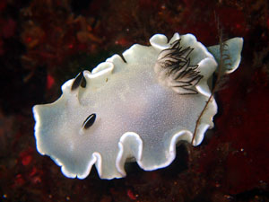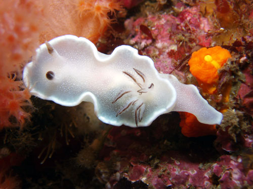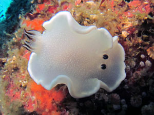 シンプルな色合いだが非常に綺麗なウミウシ。個体数は多い。