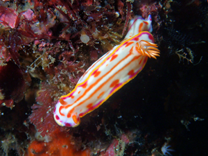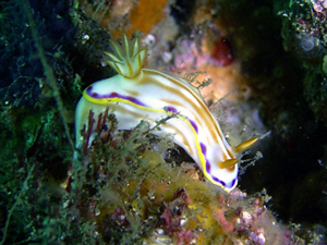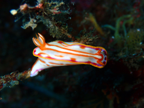 体色は白で背側の縁は黄色その内側には朱色や赤紫色の断続的な模様あり。中央部には2本の朱色や橙色の線が走る。触角は朱色から橙色で鰓は白に同色のスジが入る。