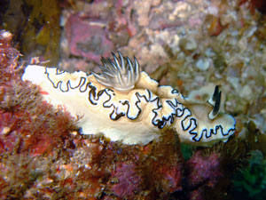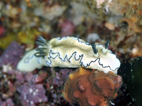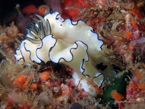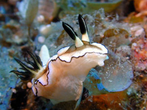 体色は白や薄い黄色。背側の縁は黒く大きく波打つ。触角と鰓は黒。