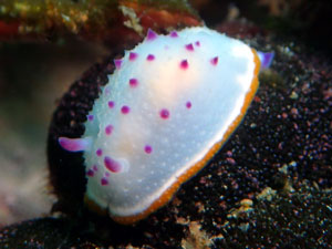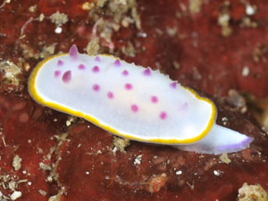 体色は白で小突起は薄紫色。触角は白で先端が紫、鰓は白で紫色のスジ。背側の縁は黄色かオレンジ色。尾部も紫色で縁取られる。