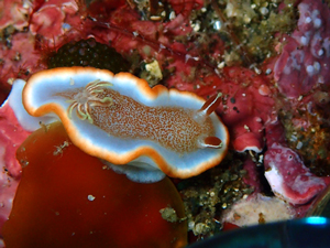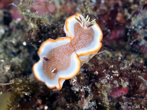 背側の縁は褐色からオレンジでその内側は白。中央部は小さな朱色や褐色の点が点在。触角と鰓は同色で触角は挟み込むように白線が入る。