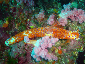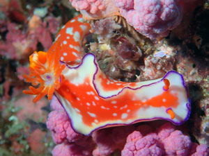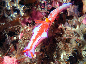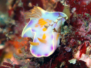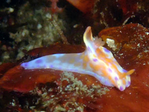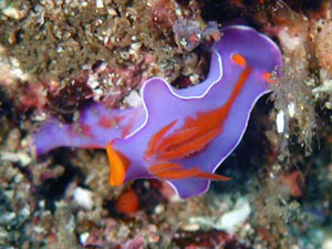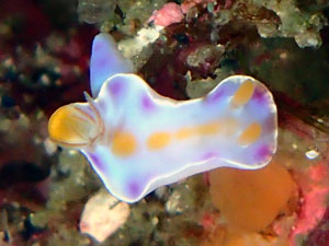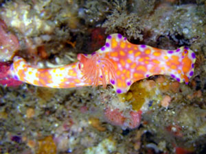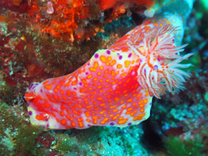 | ニシキウミウシは色彩変異が多く様々な体色。触角も鰓も同様に様々。 特徴は独特の体型にあり胴体の両サイドと鰓後方が吐出している。 大型の個体が多く10cmを超える個体も多い。特に伊東では大型の個体が多数おり容易に観察できる。色彩の違いを以下に紹介しています。 各部分の色の違を見てみてください。 |