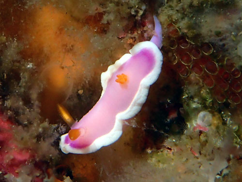 体色は薄紫やピンクで前と後ろ側が濃い紫色になる。縁は白。触角は橙色で鰓は白地に橙色。個体数は少なく稀。