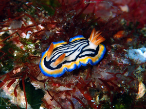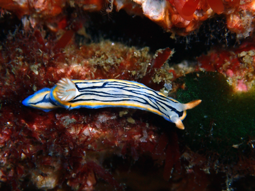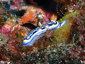 白地で縁は青、青縁の内側は黄色い縁線。黒い複数の縦線が不規則に走る。触角は橙色で鰓は白地に橙色のスジが入る。尾部中央には青黒い線が走る。本種は比較的沖合いの流れが入るポイントに多くみられる。