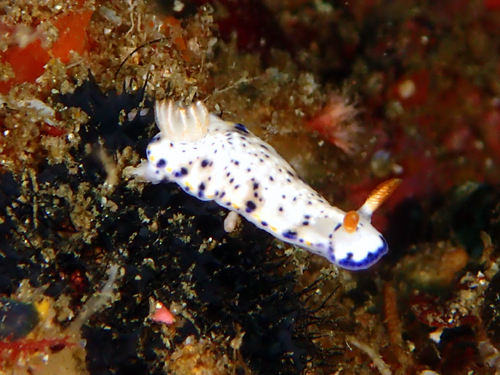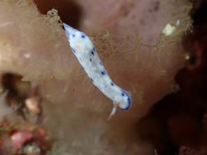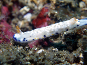 白地で背側の縁は断続的な青色。さらに青に並ぶように断続的な黄色が入る。表面はプツプツとした小さな突起が並んでいる。触角は白で先端が朱色や橙色。鰓も白く朱色か橙色のスジが入る。