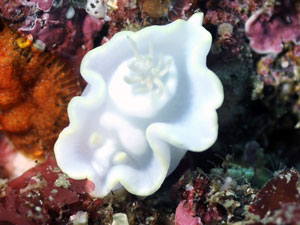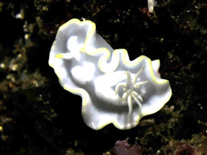 体色は白で背側の縁は黄色で波打つ。触角と鰓も白色。中心に3つに分かれた模様があり(繋がっていることもある)、2番目の模様は「ハート型」なのも特徴の一つ。この模様からも人気がある。