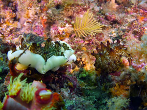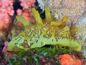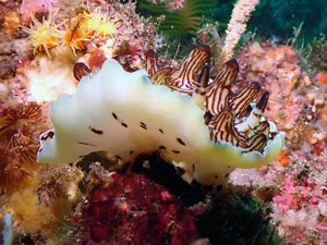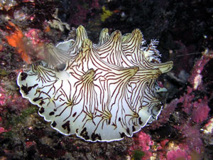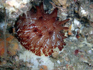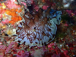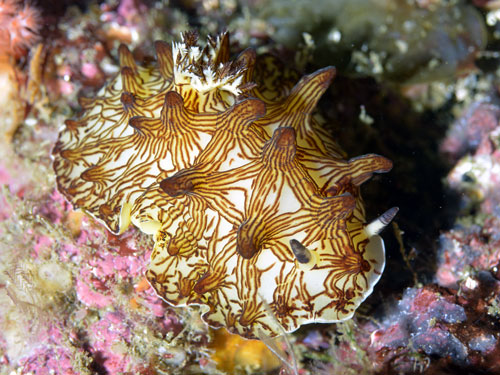 | 体色は白地や黄色味がかった色で縁は細い白色。大きく吐出した突起が複数あり暗色や茶色の線が放射状に広がり複雑な模様となる。 腹下の裏側には黒色斑が点在。触角は白地で上部半分が黒い。 10cmを超える大型のウミウシで伊東ではドロップオフなど少し深めに多く生息し、1個体いればそばに数個体いることが多い。 |