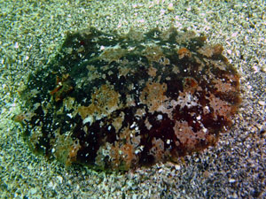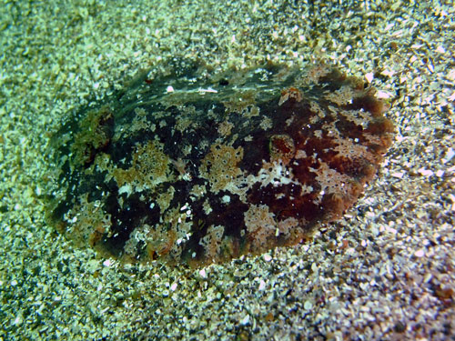 こげ茶色に薄い茶色や灰色のまだら模様が特徴。とにかく地味だが大型のウミウシ。10cm越える大きさになる。