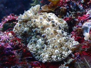 体色は褐色や茶褐色。複数のイボ状の丸い突起を持つ。突起は褐色や紫がかった色で白色が突起を囲う。 10cmを超える大型。