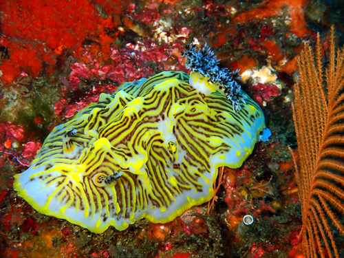 乳白色の体色に大きくない、なめらかな突起があり、縁は黄色。無数の黒色線と黄色線が入り混じり模様を作る。大型のウミウシで10cm程度のものもいる。色彩変異が多い。伊東ではこのタイプと暗色線が鮮明で迷路のような模様になる個体が多い。