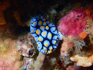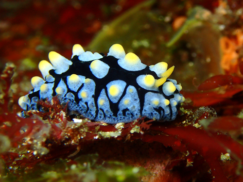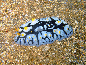 黒地に青い突起で突起先端は黄色。黒い網目模様に見えるが地の色が黒。触角は黄色。 伊東では3〜4cmの個体が多くみられる。