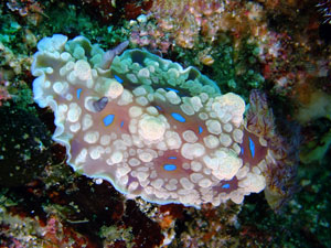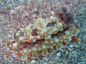 茶褐色の体色にクリーム色の突起が複数点在。体表に青い斑紋がちりばめられている。触角も褐色で紫がかる。鰓も同様。10cmほどまで達する大型。砂地からゴロタ、岩礁域と幅広くみられる。