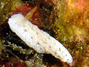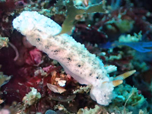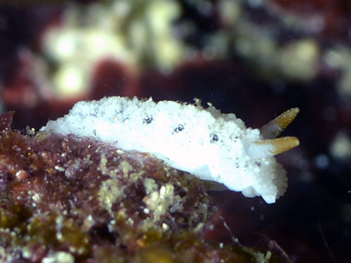 くすんだ白地で暗色班が点在。質感はスポンジというかざらついた感じの体表をしている。触角は橙色。個体数は多くない。