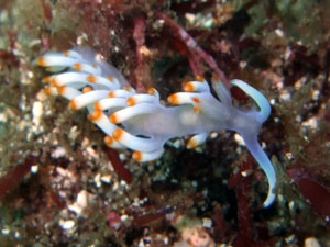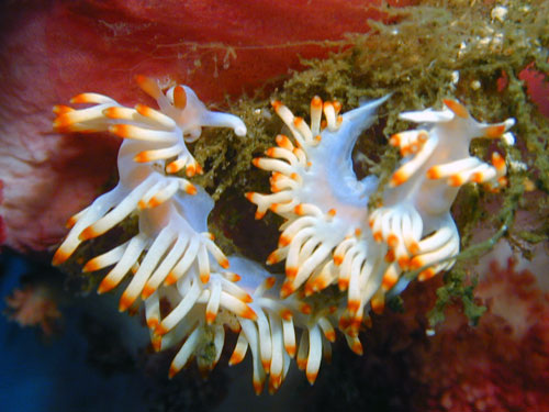 体色は白。突起も白く先が橙色。触角は白で先が橙。口触手は白い。