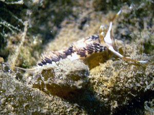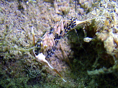 体色は白。触角と口触手は先端に向かい白・茶褐色・白の順。突起は黒く先端が白いがピンク色のまだら模様の突起が混じっている。