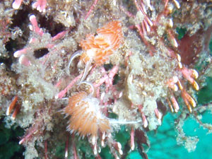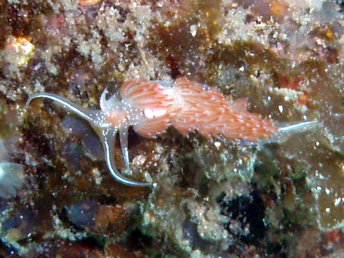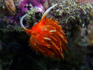 体色は半透明で薄い橙色。小さな白点が点在。突起は橙色で先端が白。
