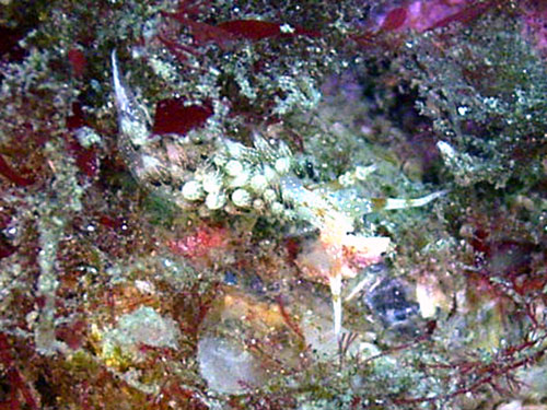 体色は半透明な白。触角には輪状の突起が3つ程度あり。口触手は白と茶。突起の先が独特で小さな玉のようになっている。