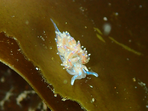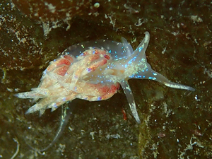 体色は透明というか薄い黄色。身体に水色の点や線が多数ある。