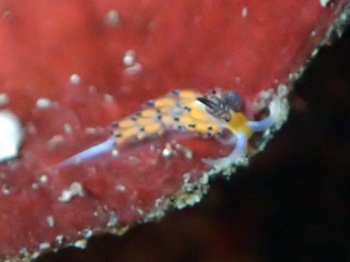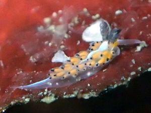 体色は透明というか若干白っぽい。背側の突起も実は透明らしく消化腺の色が透けて見えているそうです。こいつらウミウシの卵を専門で食べるようで、その餌の色がそのまま背側に出てくるとの事だが、オレンジ系の卵しか食べないってこと?そういう事にしておきましょう。