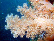 根にはびっしりと生い茂るソフトコーラル、壁一面に咲くイボヤギ、高密度に密集するイソギンチャク、等身大はあるウチワやヤギ類などまさにお花畑。それが海底に広がる白い砂地と幻想的な世界を作り出しています。景観の美しさに癒されます。